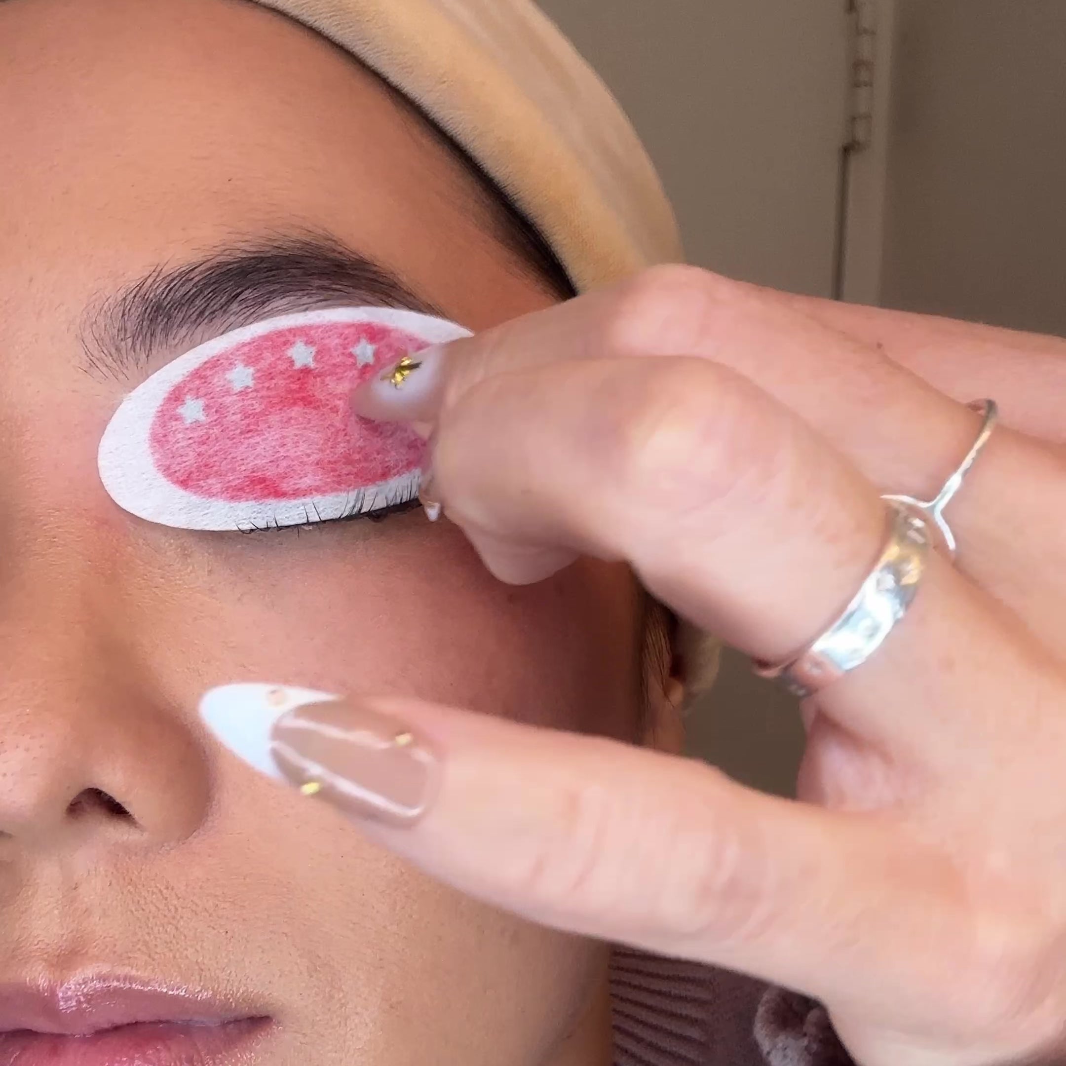 2️⃣ With the pigment-side of the oval facing your eye, line up the edges of the oval pigment next to your eye’s tearduct and above your lash line